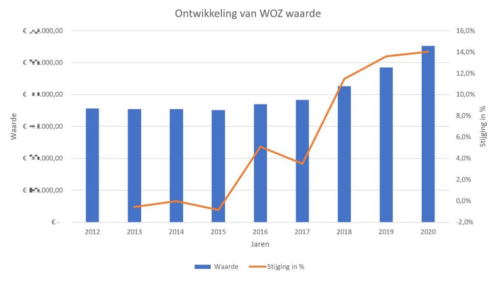 Omdat ik de stijging van de waarde nogal groot vind, heb ik even wat gegevens uit onze administratie op een rijtje gezet. Hieronder vind je de grafiek en daaronder volgt de uitleg.